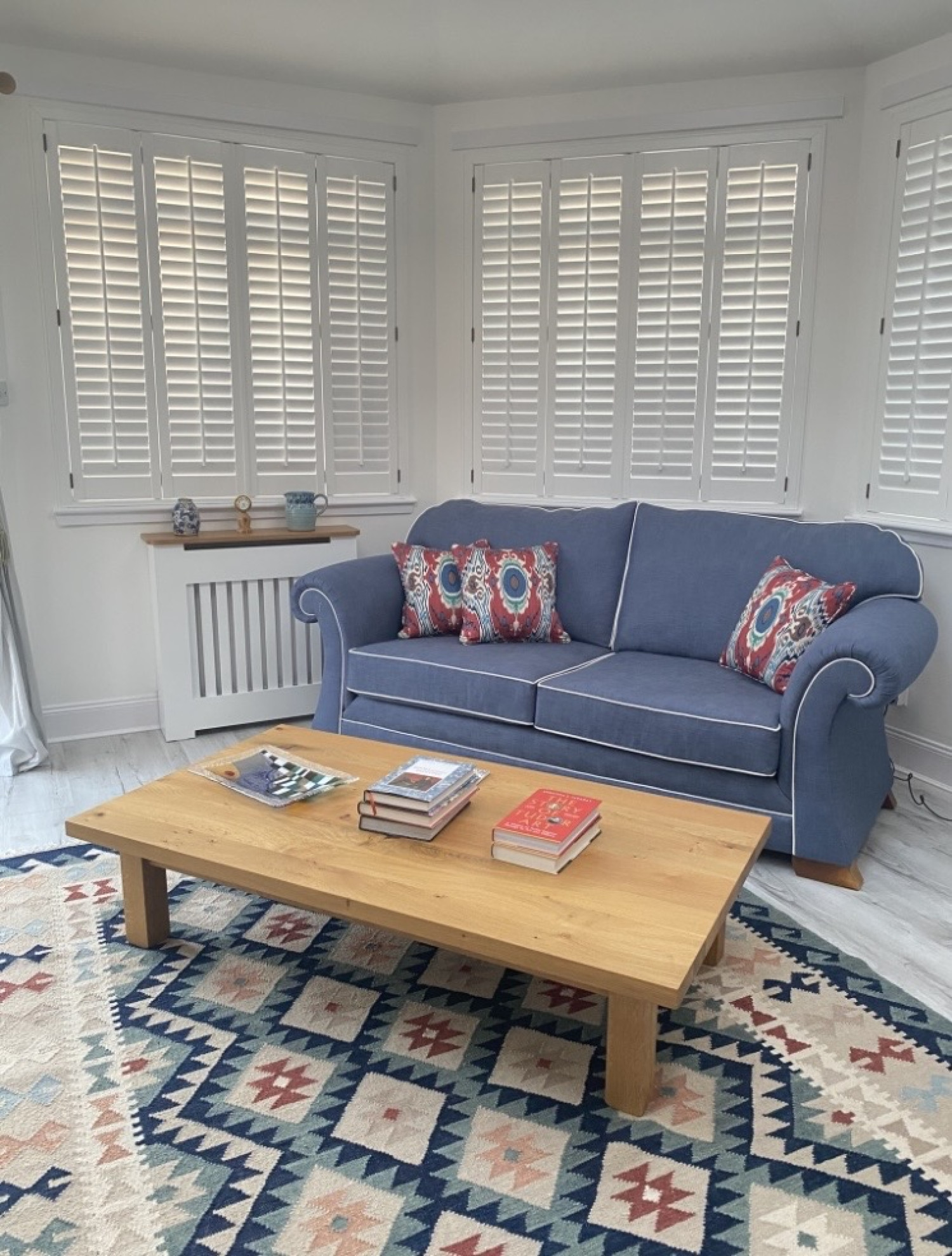 Pops of colour were added with bespoke Ikat cushions and a decorative rug to lift the scheme.